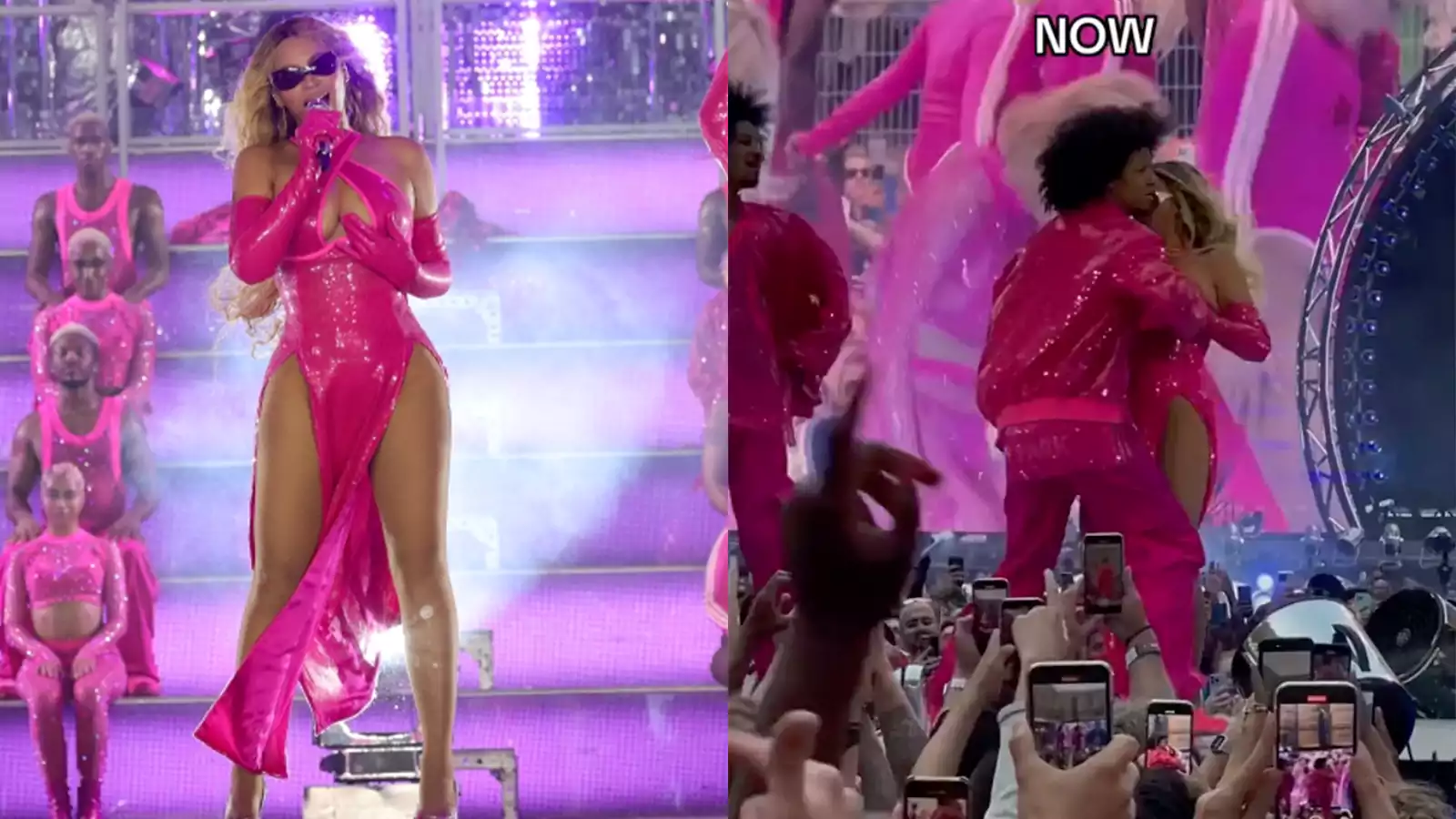 During Beyonce Renaissance World Tour performance at the Volksparkstadion in Hamburg, Germany on Wednesday, June 21, her backup dancer jumped in to prevent a wardrobe malfunction. The moment when one of her dancers hopped in and helped her avoid the malfunction was captured by a fan. In a hot pink, sequined gown with a cutout around her chest, Queen Bee, 41, performed her hit song and Renaissance leads single “Break My Soul.”. It appeared that one of the straps holding her cover was loose. A dancer hopped in front of her, grabbed her hand, and performed a quick dance move before pressing her hand against her breast to keep the dress firmly in place.