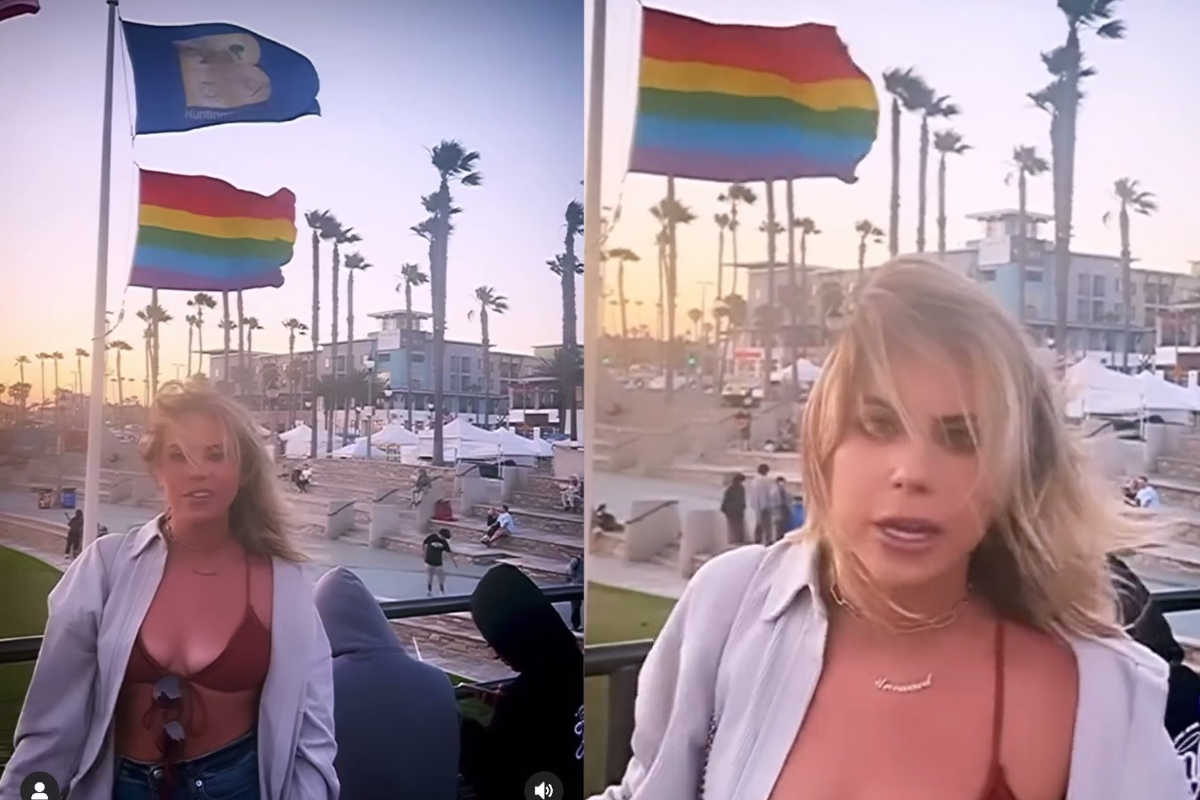 One user wrote, ‘I have absolutely NO idea who this chick is, but based on that rant, I’m inclined to replace every flag in Huntington Beach with a pride flag year-round. I’ll put a whole forest of them right outside her front door, just for good measure.’