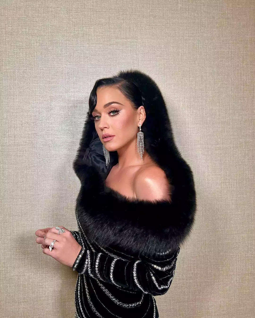 Perry exuded style in a metallic jacket, black turtleneck, and hoop earrings.