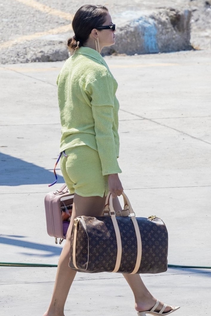 Selena Gomez glows in a bright green look alongside while embarking on a boat in Positano, Italy on Sunday afternoon.