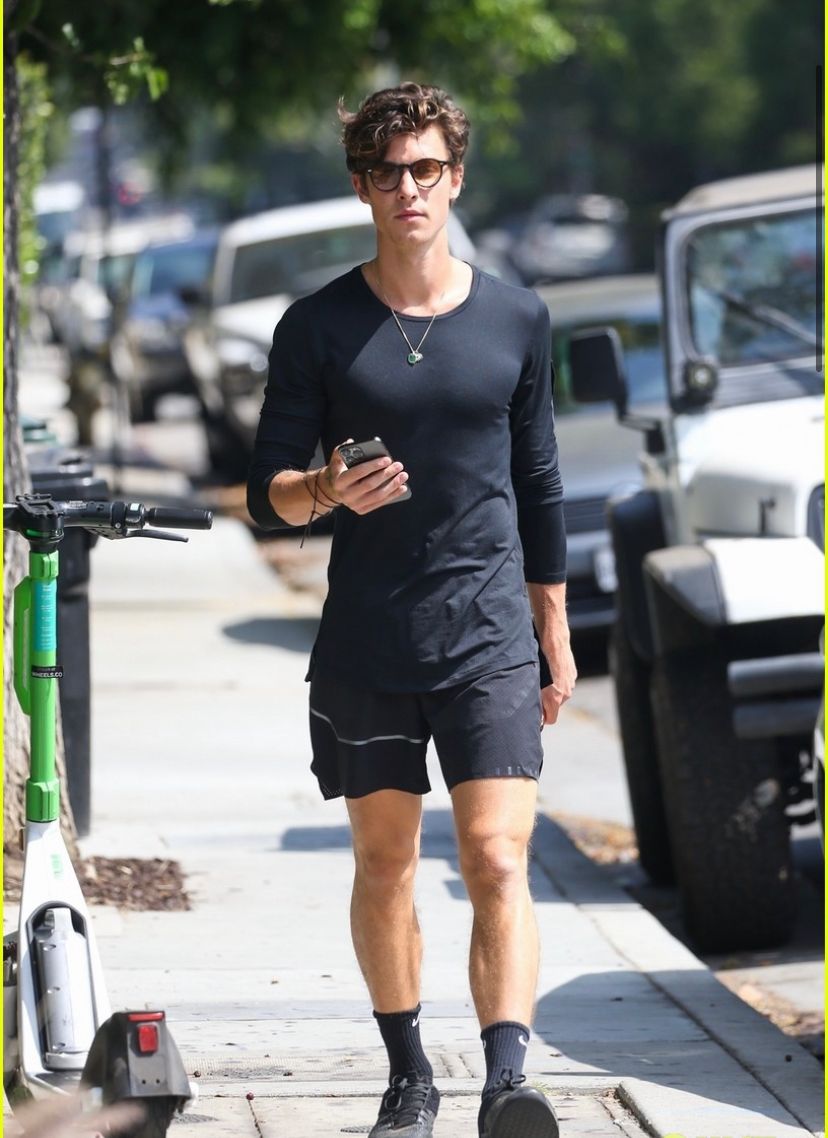For his outing, Shawn went sporty in a long-sleeved black athletic shirt